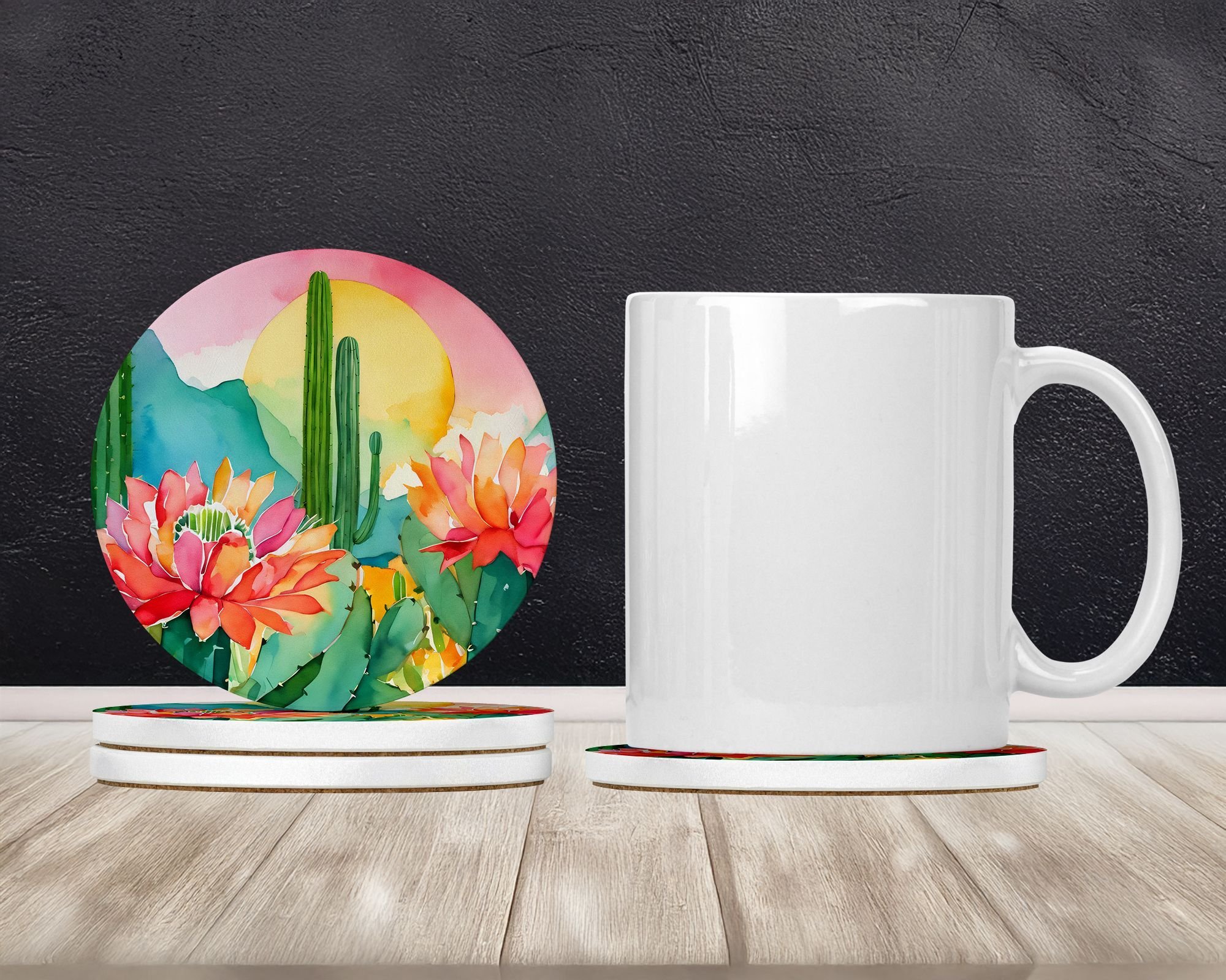 Arizona Saguaro Cactus Blossom in Watercolor Large Sandstone Coasters Pack of 4 Absorbent Round Coasters Decor Gifts for Men or Women, 4 in